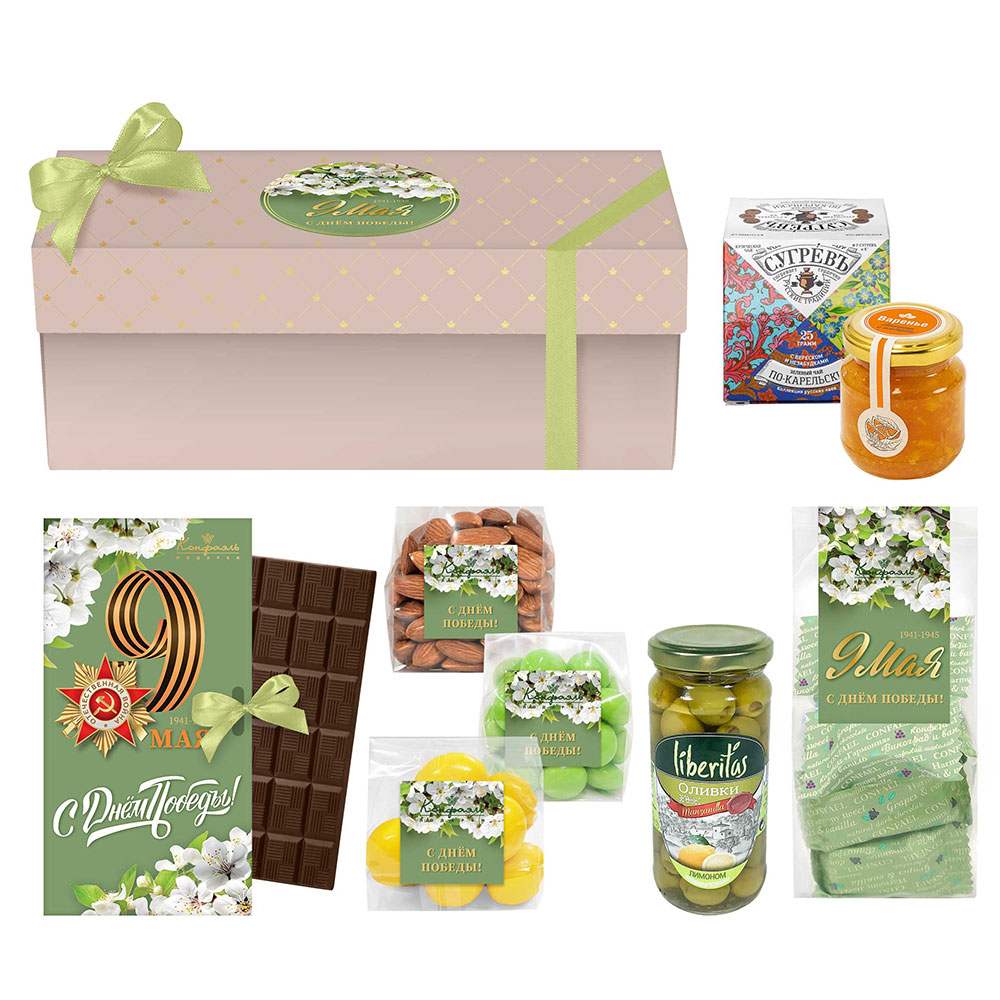 "9 мая" подарочный набор: шоколад, драже, оливки, чай, варенье