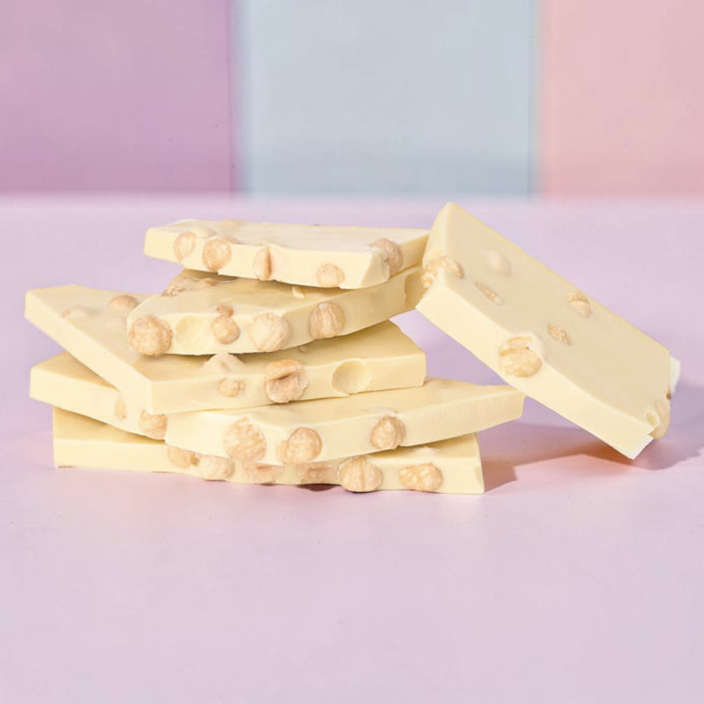 Нежный вкус белого шоколада органично сочетается с удивительно богатым вкусом цельных орешков фундука. Этот орех поставляет в организм человека белки, Vit В и Е, кальций, калий, магний, железо и другие ценные вещества.