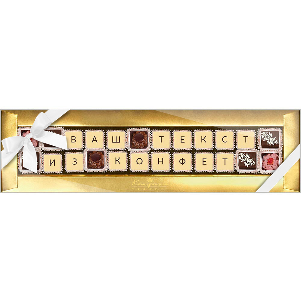 Текст выкладывается съедобной шоколадной мозаикой, которую с удовольствием съест получатель.