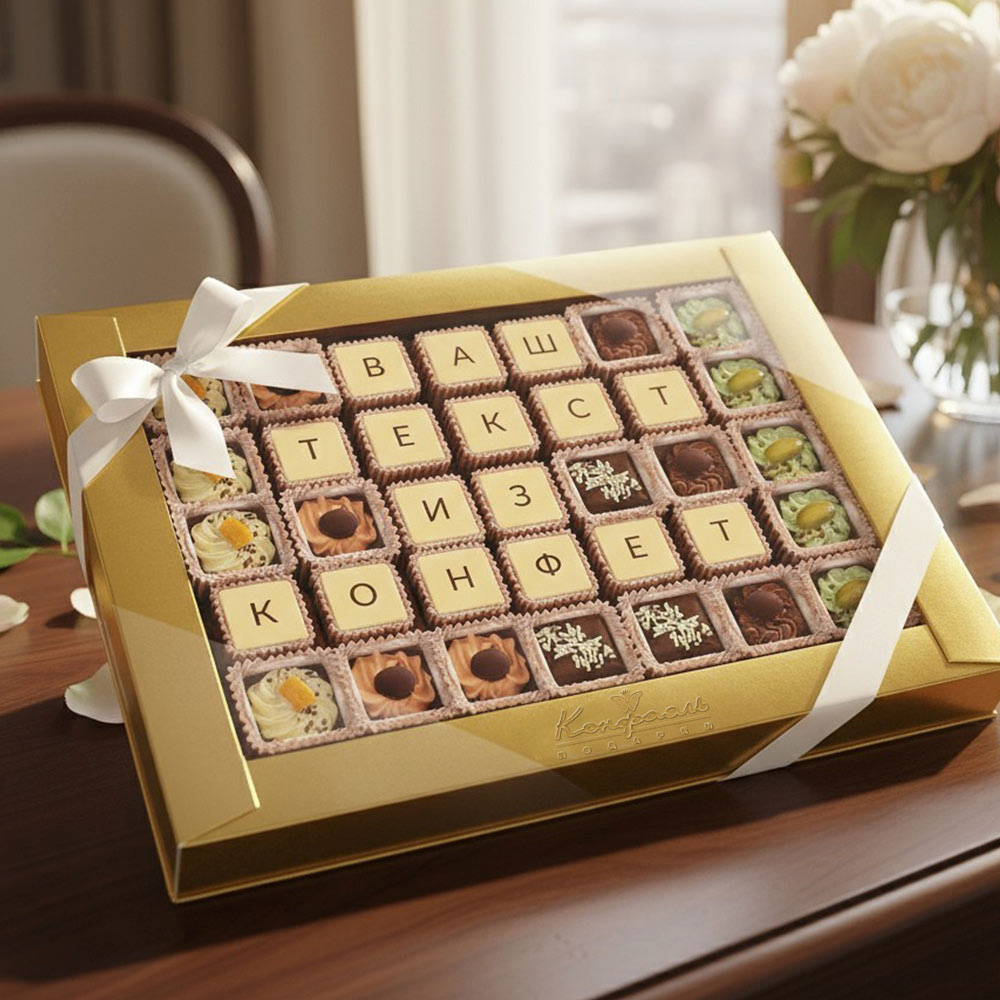 Текст выкладывается съедобной шоколадной мозаикой, которую с удовольствием съест получатель.