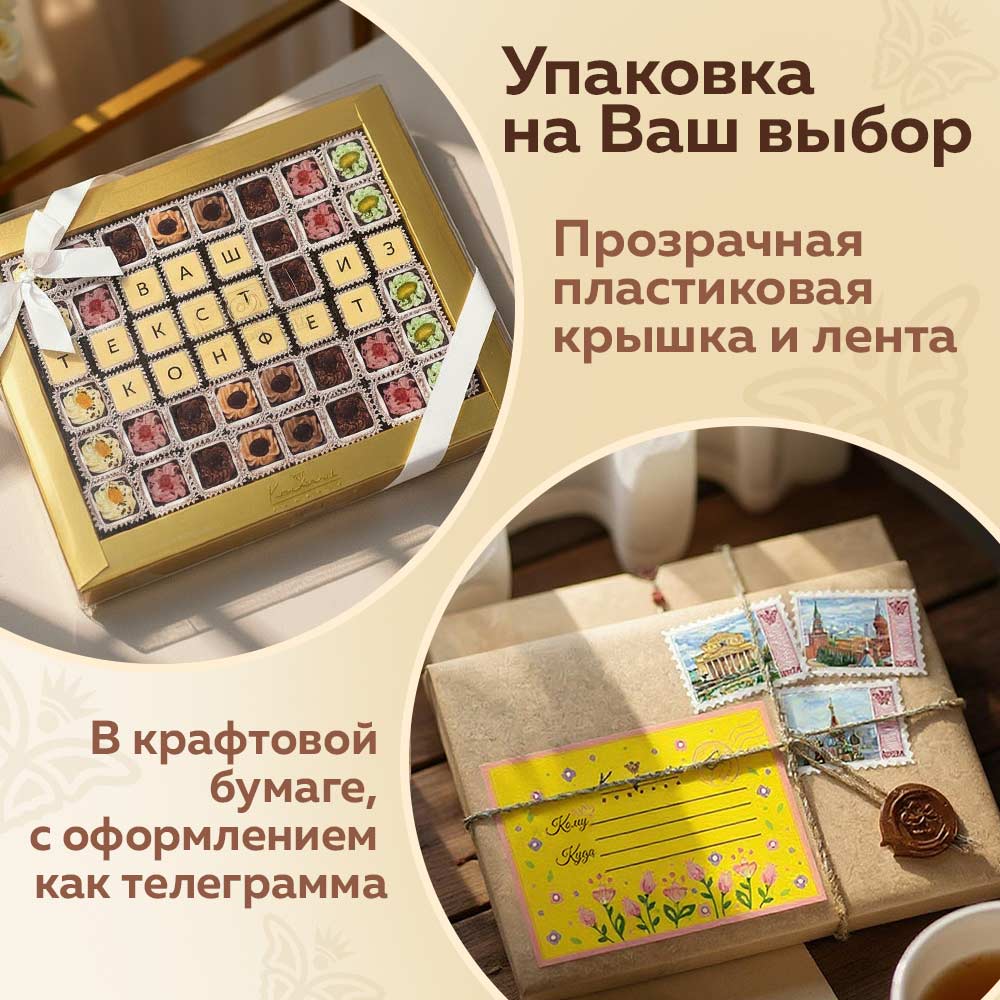 Шокотелеграмма из 48 конфет – это прекрасная возможность поздравить дорогого человека оригинальным способом: шоколадными словами.