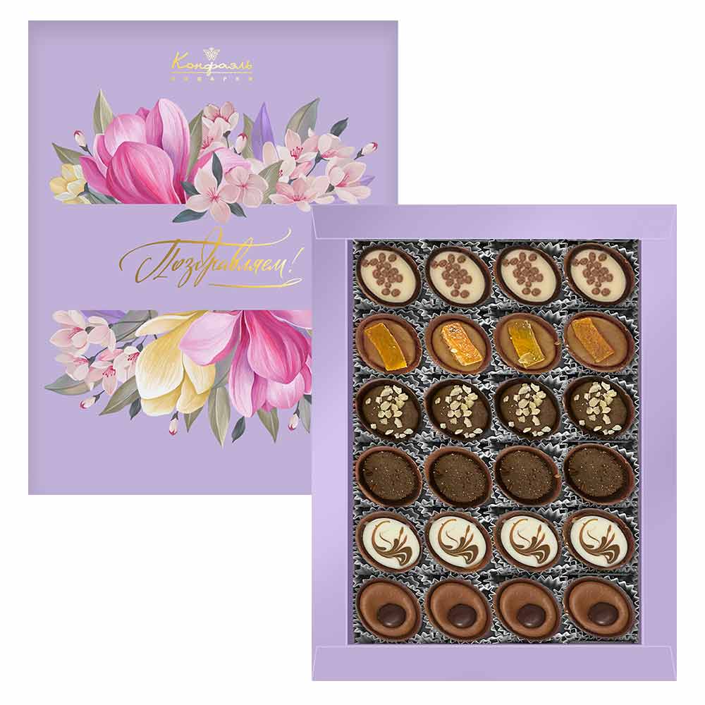 Состав: шоколадные массы – сахар, тертое какао, какао-порошок, масло какао, пахта сухая, сухое обезжиренное молоко, сухое цельное молоко, эмульгатор (лецитин соевый), соль, натуральная ваниль; начинки – сахар, патока, молоко сгущенное (молоко цельное, сахар (сахароза, лактоза)), сливки сгущенные с сахаром (сливки нормализованные, сахар (сахароза), лактоза), молоко сухое цельное, масла растительные рафинированные дезодорированные (подсолнечное, рапсовое, оливковое; масло сладко-сливочное, молоко сухое обезжиренное), сахарная пудра, жир специального назначения (масло ши, рапсовое масло, соевое масло), коньяк (дистиллят коньячный, вода, сахар, пищевой краситель «Сахарный колер»), консервант (сорбиновая кислота), регулятор кислотности (лимонная кислота), эмульгаторы (лецитин соевый, Е471), ароматизаторы, пищевые красители «Сахарный колер». Продукция производится на предприятии, где используются арахис, кунжут, орехи, яичные и молочные продукты, злаки, содержащие глютен.