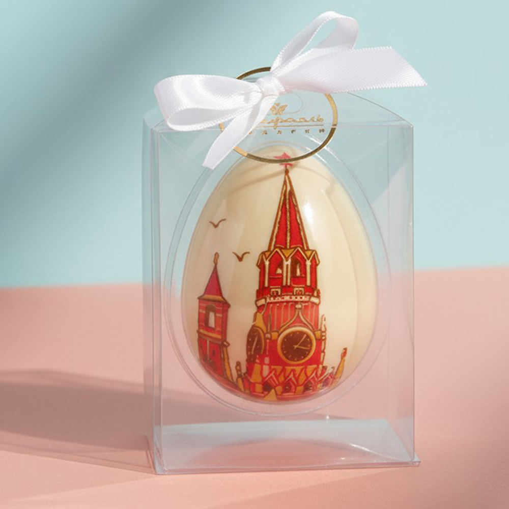 Яйцо «Кремль», изготовленное из белого шоколада и упакованное в прозрачный футляр, - очень вкусный десерт и оригинальный сувенир для ваших близких и друзей.