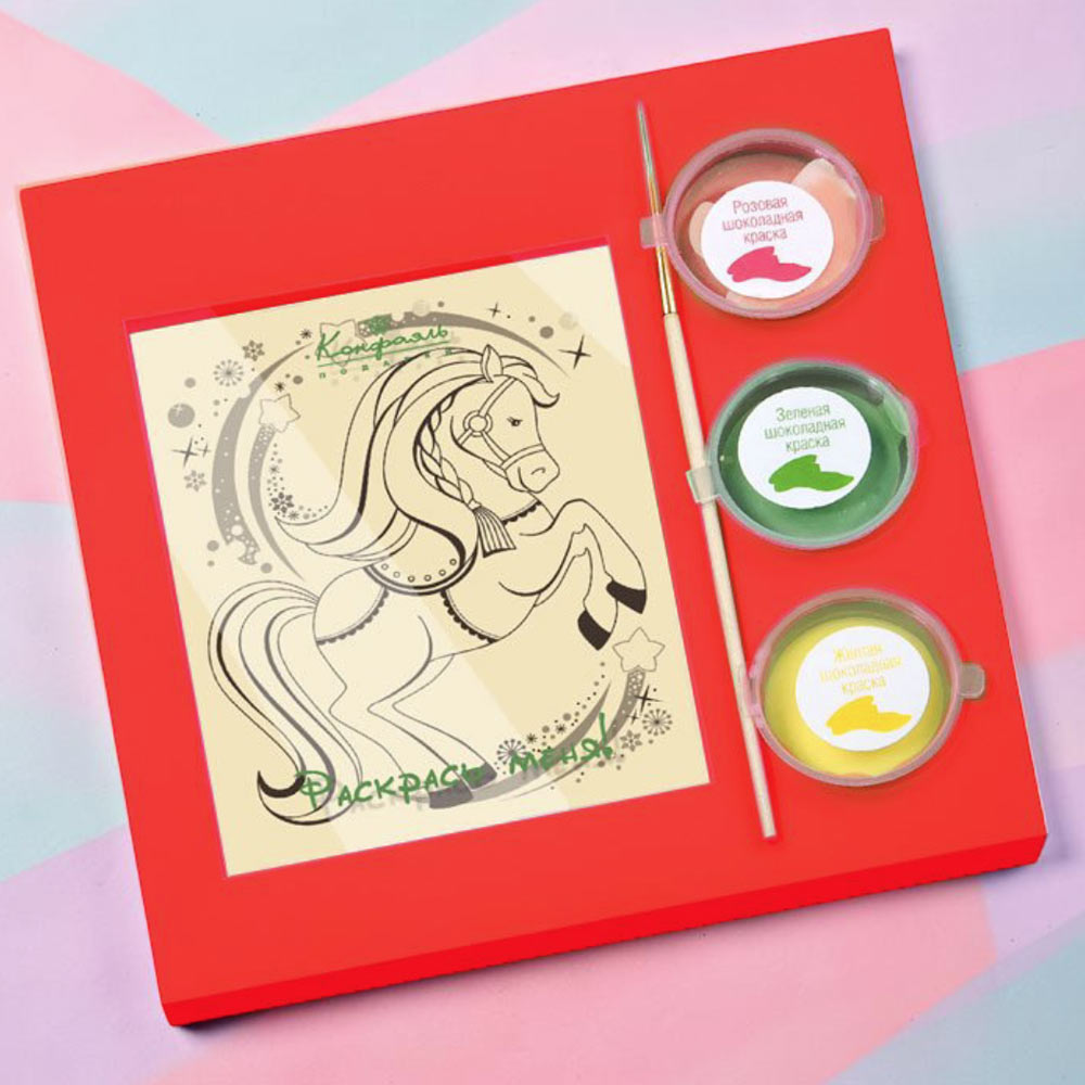 Для ваших милых сладкоежек-малышей - вкусный набор-раскраска «Лошадка» с разноцветным шоколадом.