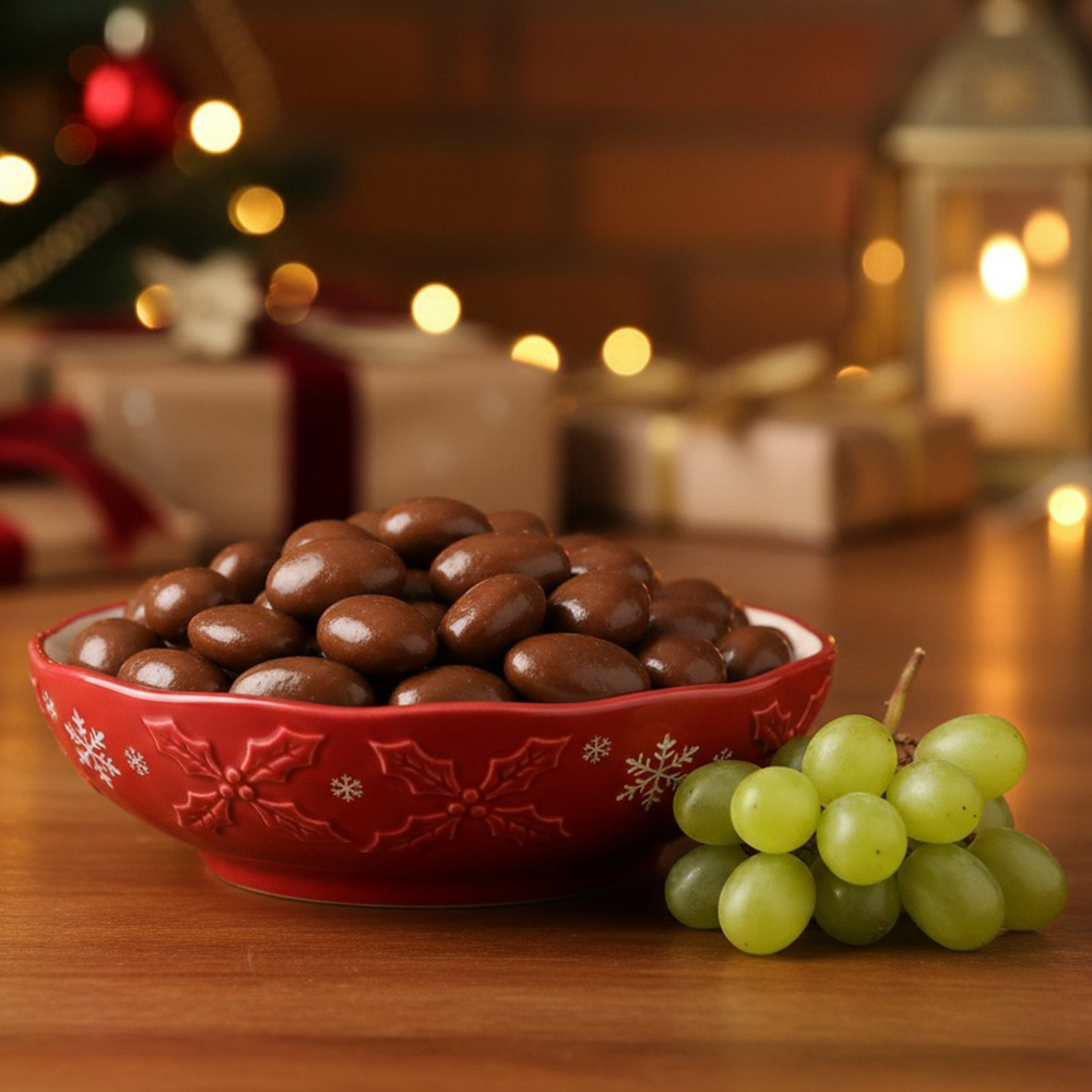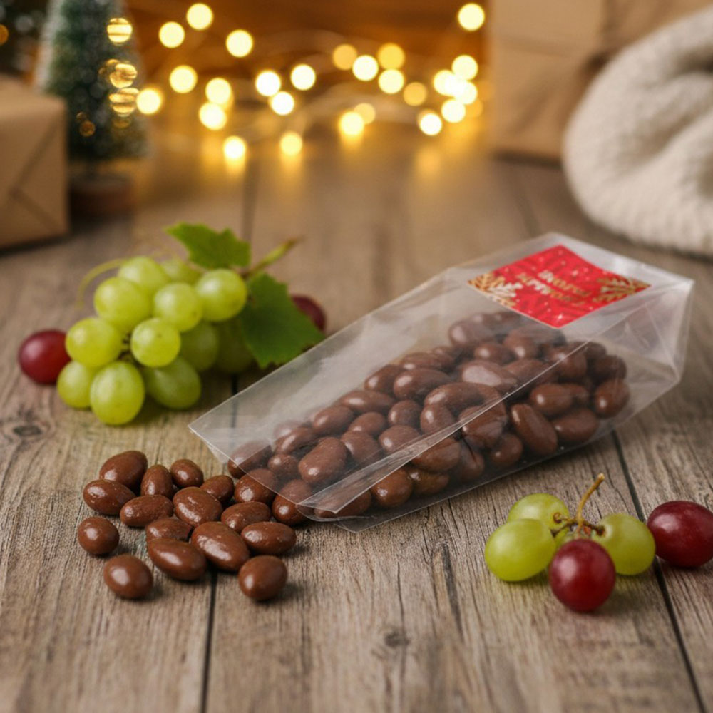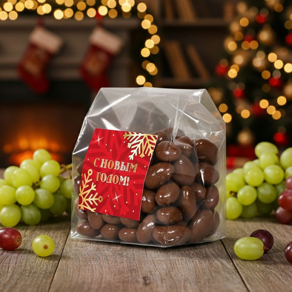 Состав: сахар, тертое какао, масло какао, сыворотка молочная сухая, пахта сухая, эмульгатор (лецитин соевый); начинки – сахар, патока, виноград сушеный, какао-порошок, ароматизаторы, декор – глазирователь (капол). Внимание! Продукция производится на предприятии, где используются арахис, кунжут, орехи, яичные и молочные продукты, злаки, содержащие глютен.