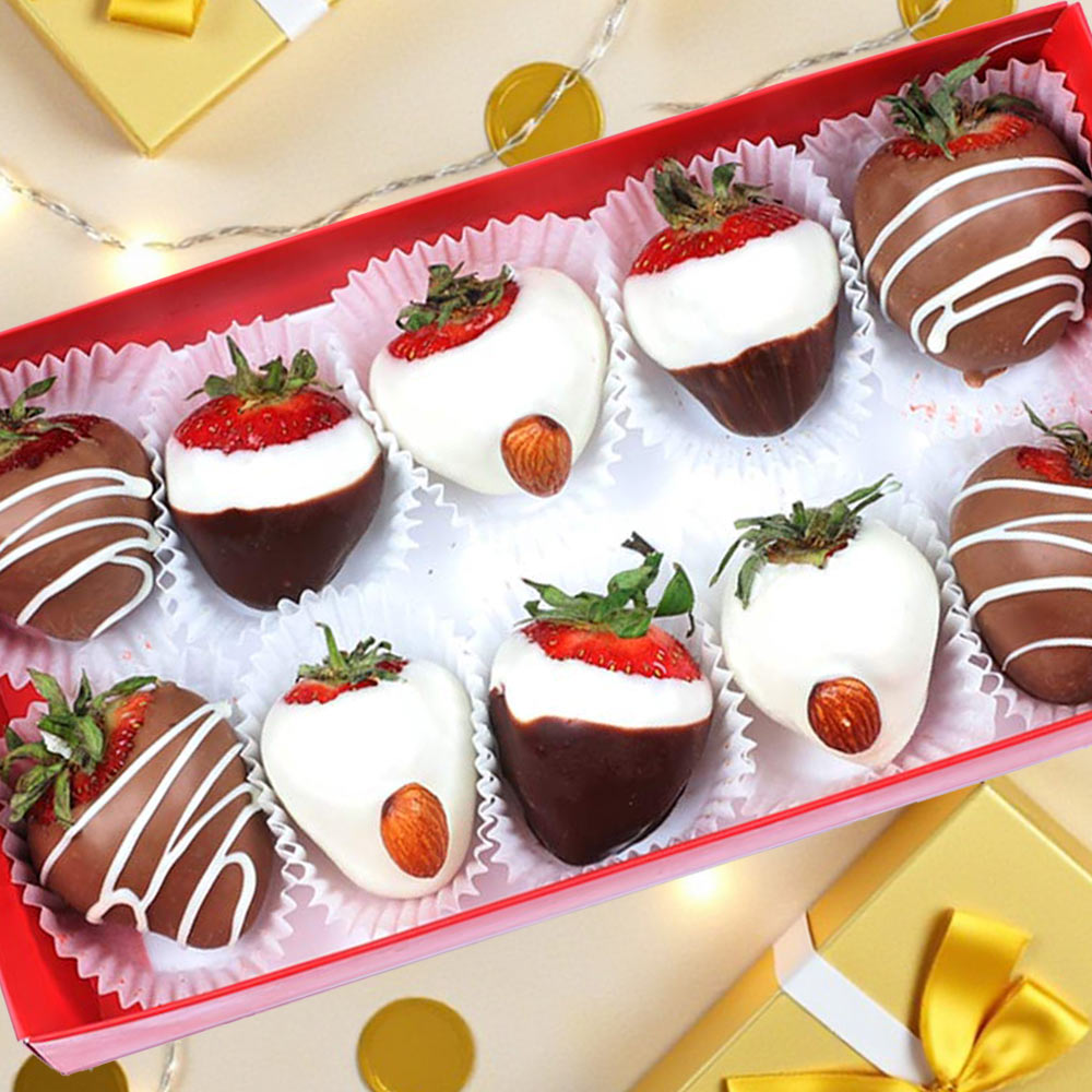 Конфеты глазированные "Клубника в шоколаде" с декором белым, горьким, молочным шоколадом и миндалем