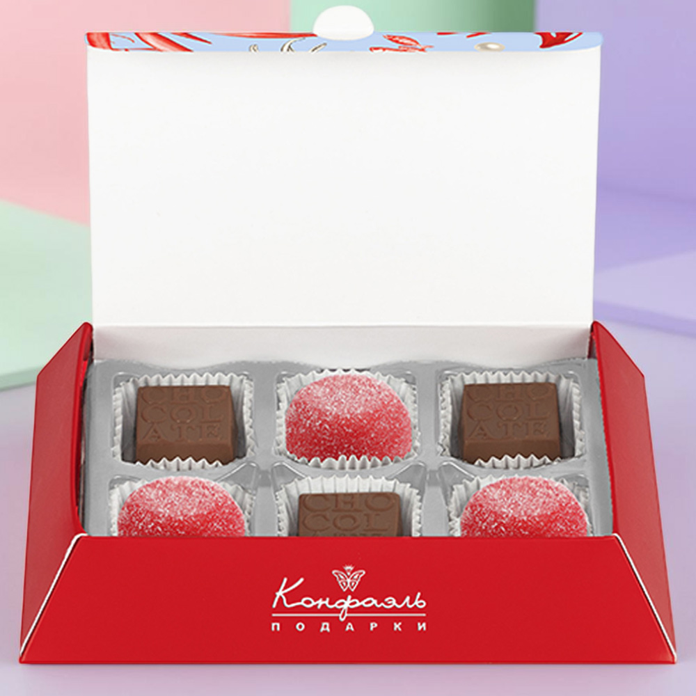 Состав: шоколад – сахар, масло какао, сыворотка молочная сухая, сухое цельное молоко, какао тёртое, эмульгатор (лецитин соевый), ароматизаторы; начинки – сахар, патока, жир специального назначения (масло ши, рапсовое масло, соевое масло, антиокислитель (лимонная кислота)), молоко сухое цельное, молоко сухое обезжиренное, белый шоколад (сахар, молоко сухое цельное, масло какао, эмульгатор (лецитин соевый), ароматизатор, соль), вафельная крошка( мука пшеничная х/п первого сорта, сахар, масло кокосовое рафинированное дезодорированное, эмульгатор (лецитин соевый), пшеничные волокна (клетчатка), ароматизатор), желирующий агент (агар), желатин говяжий, регулятор кислотности (лимонная кислота), ароматизаторы, пищевые красители (Е171, красный свекольный, медные комплексы хлорофиллов и хлорофиллинов). Внимание! Продукция производится на предприятии, где используются арахис, кунжут, орехи, яичные и молочные продукты, злаки, содержащие глютен.