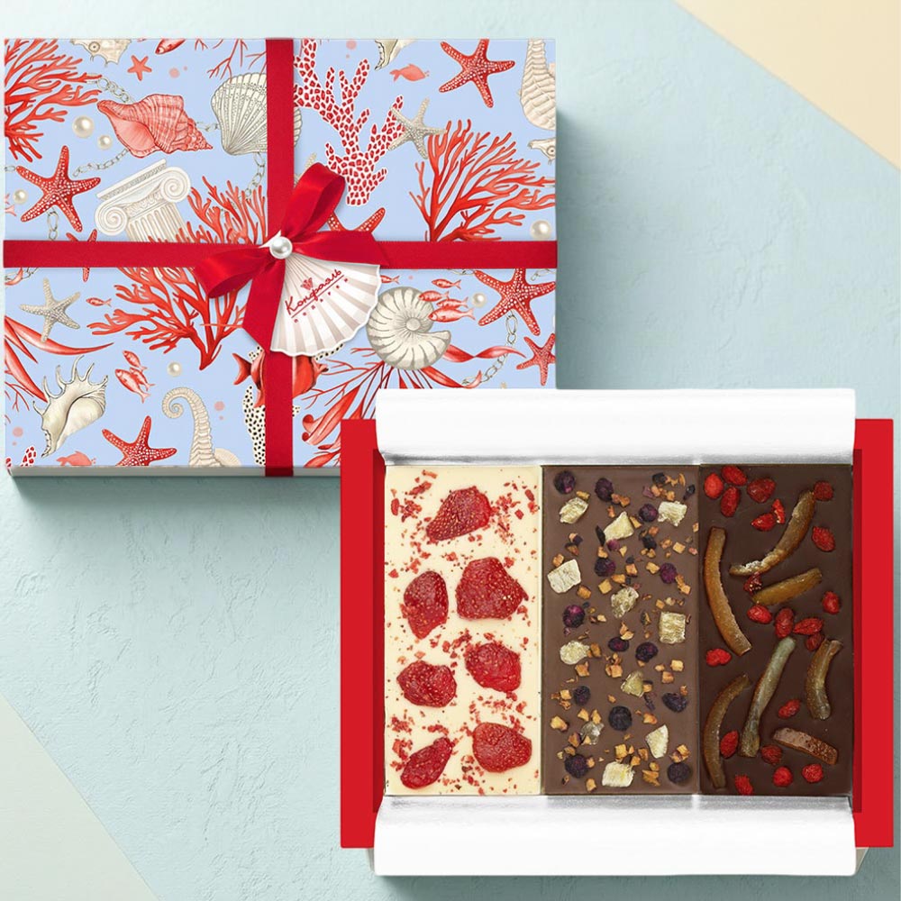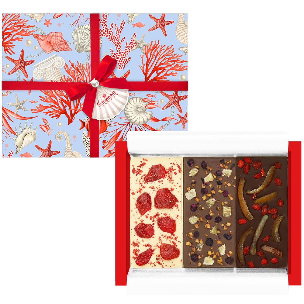 Шоколад белый с клубникой и малиновым кранчем, Шоколад молочный с цукатами ананаса, с кусочками сливы и ягодами голубики, Шоколад горький ягодами Годжи и цукатами из апельсиных корочек