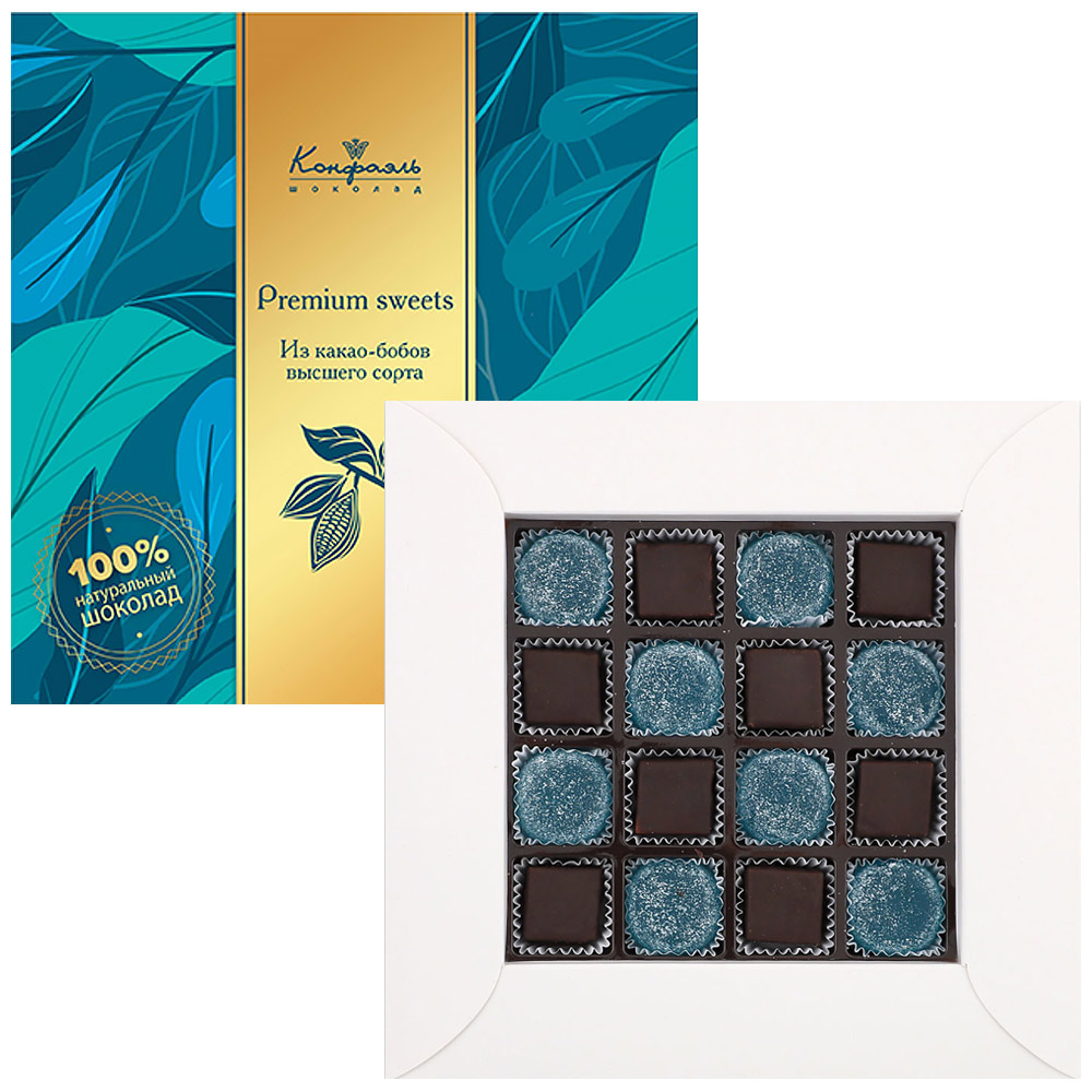 Состав: шоколадная масса – сахар, какао тертое, масло какао, какао-порошок, эмульгаторы (соевый лецитин, Е476); начинки – сахар, патока, молоко сгущенное (молоко цельное, сахар (сахароза, лактоза)), масло сладко-сливочное, белок яичный, натуральный концентрированный яблочный сок, желирующий агент (агар), желатин говяжий, регулятор кислотности (кислота лимонная), консервант (сорбиновая кислота), эмульгатор (Е471), экстракт ванили, ароматизаторы, пищевой краситель
