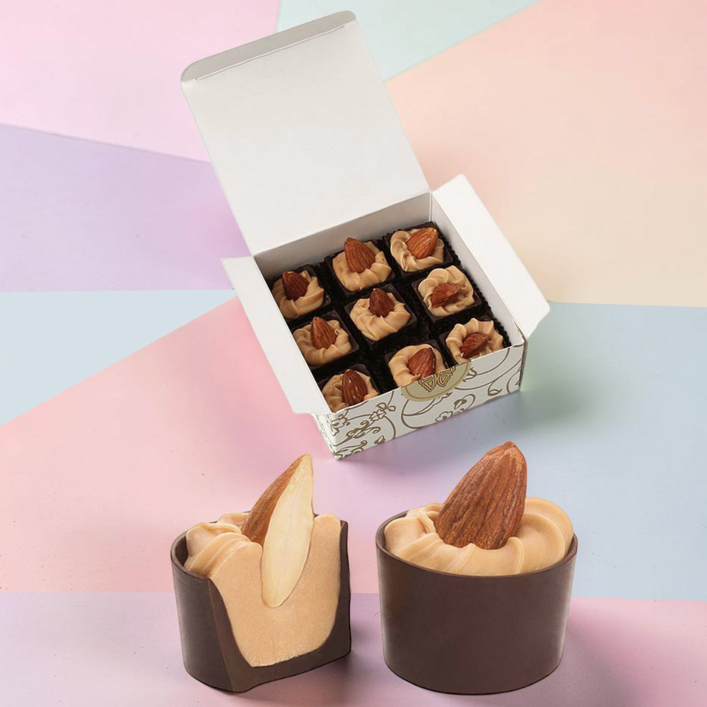 Маэстро-Аманд - шоколадный стаканчик с двухслойной начинкой из марципана и ореховой массы «Джандуйя», украшенный цельным орехом миндаля