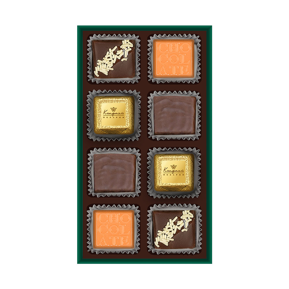 Состав: шоколадные массы – сахар, масло какао, молоко цельное сухое, сухое обезжиренное молоко, какао тертое, какао-порошок, сыворотка молочная сухая, пахта сухая, молочный жир, паста ореховая из ядер фундука, эмульгаторы (соевый лецитин, Е476), соль, натуральная ваниль, ароматизаторы; начинки – сахар, патока, белок яичный порошкообразный, молоко сухое, масла растительные рафинированные дезодорированные (подсолнечное, рапсовое, оливковое; масло сладко-сливочное, молоко сухое обезжиренное), молоко сгущенное (молоко цельное, сахар (сахароза, лактоза)), масло сладко - сливочное, какао тертое, какао масло, клубника сушеная, кумкват сушеный, цукаты лимонных корочек, папайя сушеная, ананас сушеный, финики, чернослив, абрикос сушеный, ядра орехов фундука, ядра орехов миндаля, стабилизатор (мальтодекстрин), желирующий агент (агар), коньяк (дистиллят коньячный, вода, сахар, пищевой краситель «Карамельный колер""), спирт этиловый ректификованный, консервант (сорбиновая кислота), регулятор кислотности (лимонная кислота), эмульгаторы (лецитин соевый, Е471), сухой сок моркови, сухой сок апельсина, экстракт маракуйи, ароматизатор. Внимание! В продукте возможно наличие фрагментов фруктовых косточек (кураги натуральной, фиников натуральных, чернослива натурального).