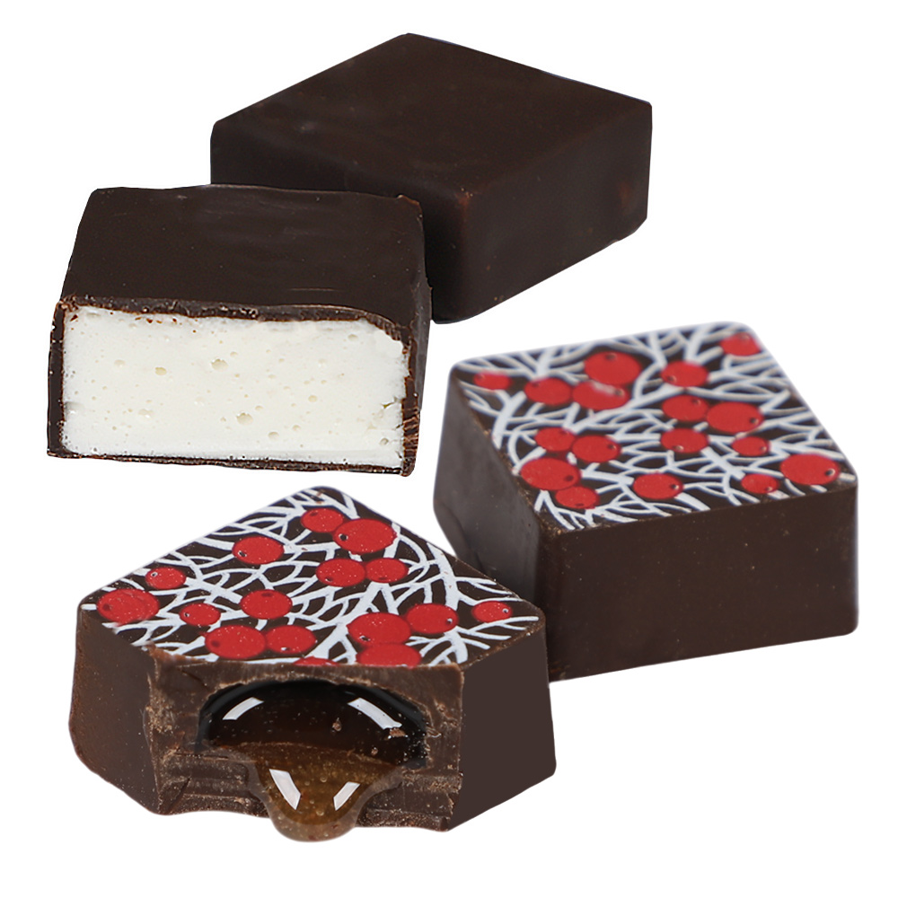 Конфеты глазированные горьким шоколадом «Суфле» (ванильное), шоколадные конфеты типа «Ассорти» из молочного шоколада с желейной начинкой Лимончелло и декором
