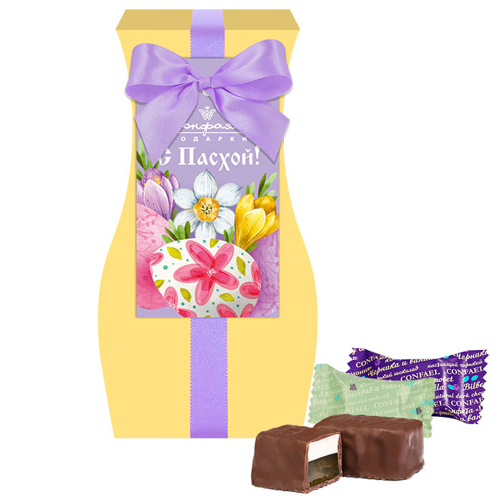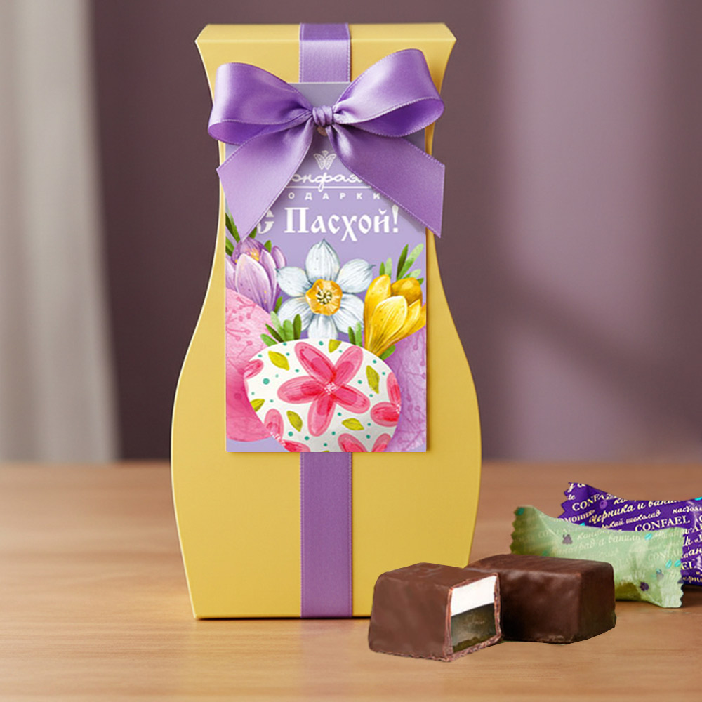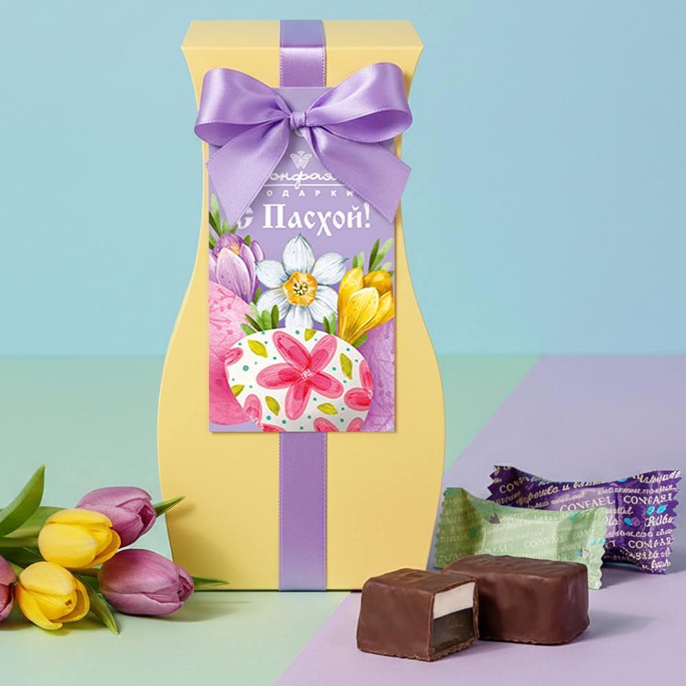 Состав: шоколадная масса – сахар, тертое какао, масло какао, какао-порошок, эмульгатор (лецитин соевый), натуральная ваниль, начинки – сахар, патока, молоко сгущенное (молоко цельное, сахар (сахароза, лактоза)), масло сладко-сливочное, яичный белок, натуральные концентрированные соки