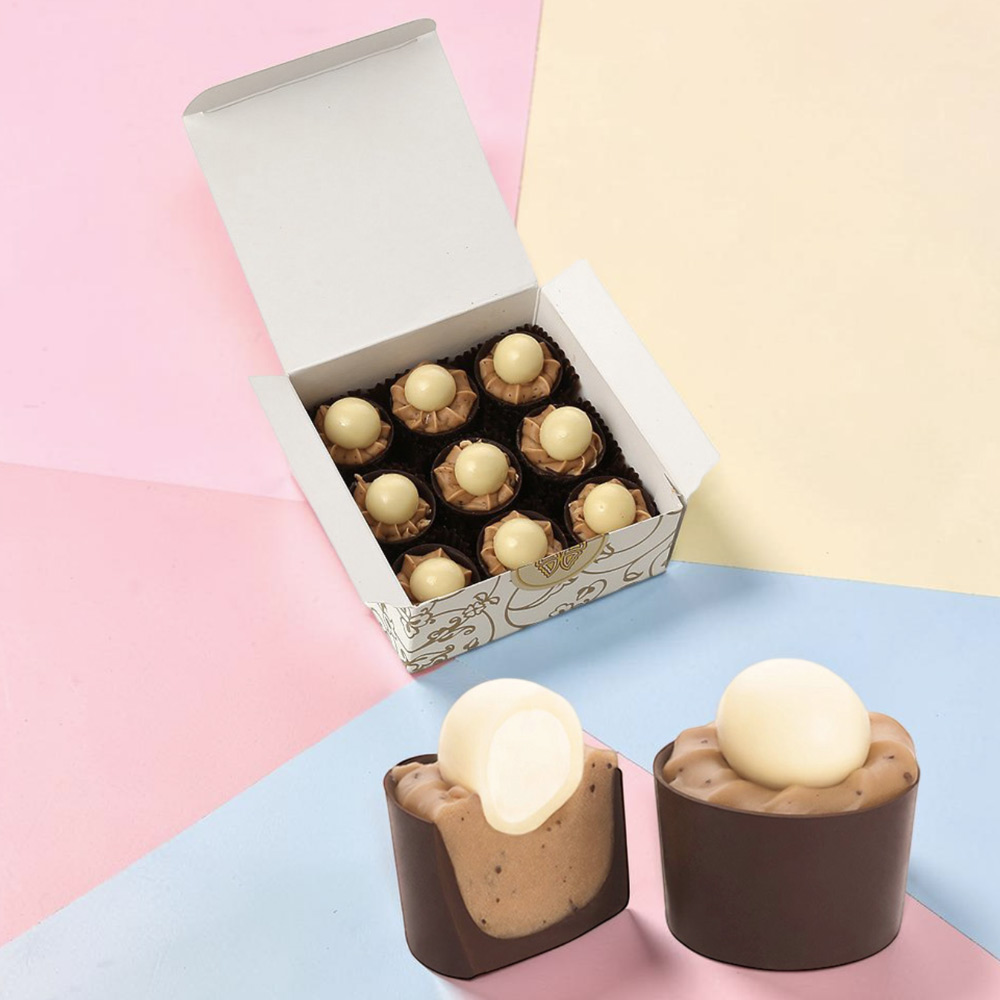 Пастораль- шоколадный стаканчик с начинкой из кофейного крема, украшенная драже «Фундук в белом шоколаде»