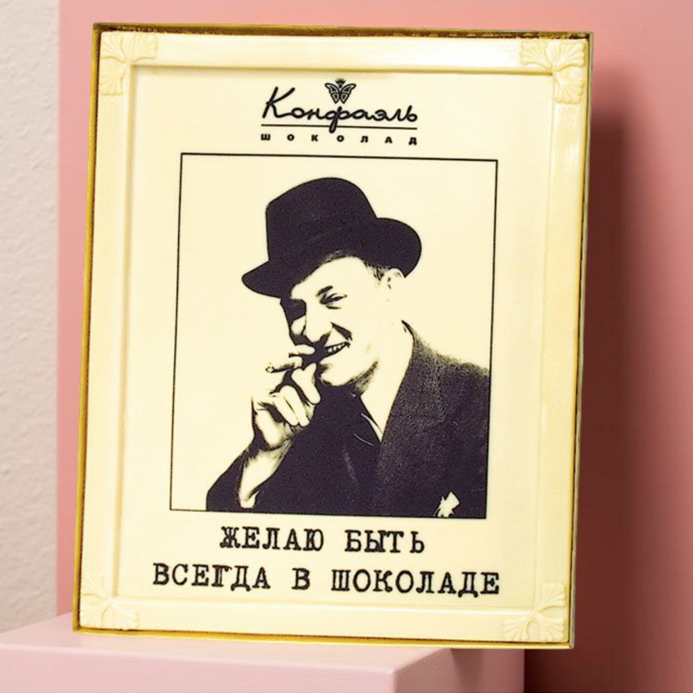 Это лакомство премиум-класса изготовлено из отборных сортов белого шоколада, упаковано в крафт-коробку и украшено шутливой надписью.