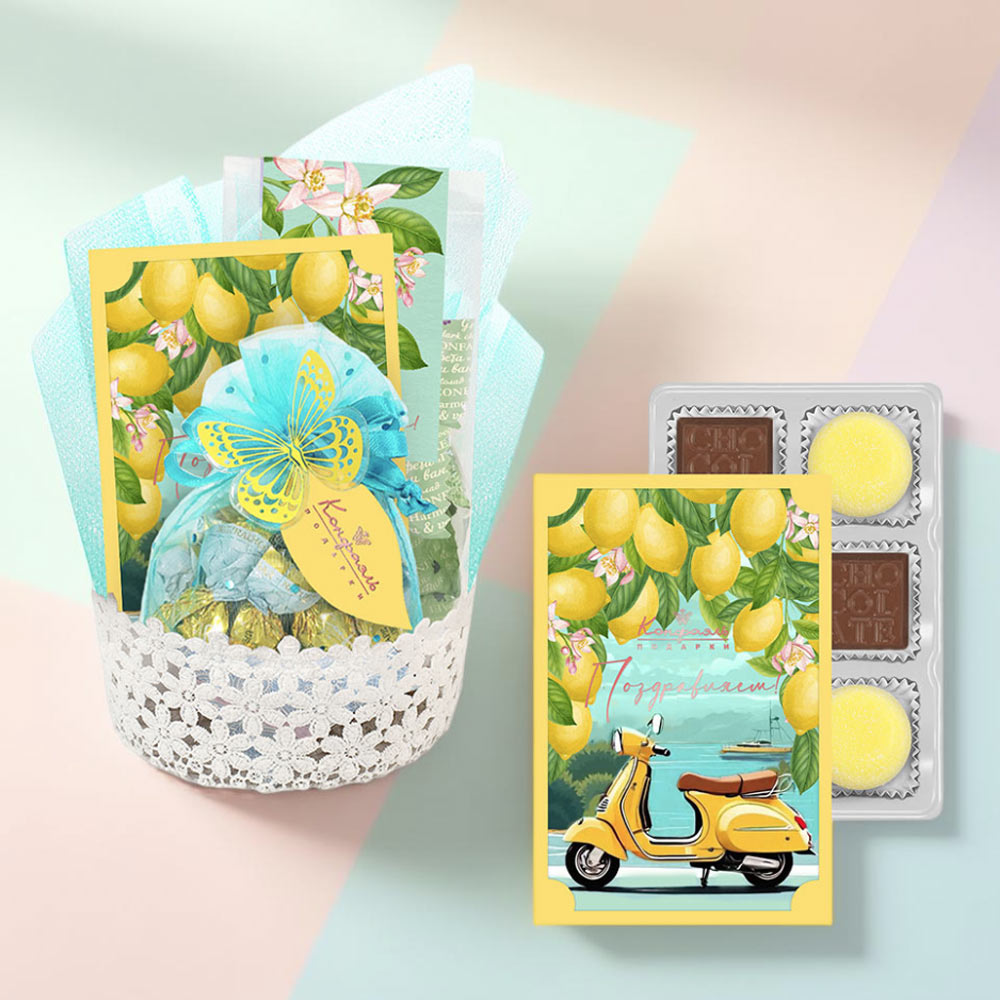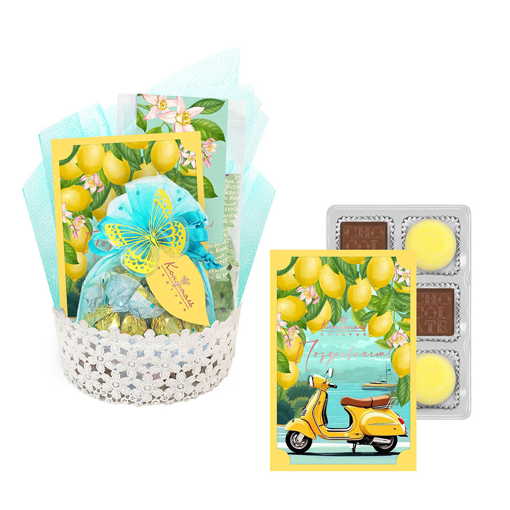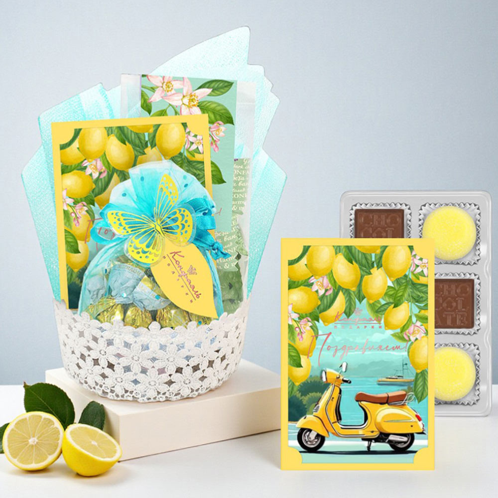 Подарочная корзина: мармелад, конфеты глазированные, конфеты "Ассорти" из коллекции Лимонная