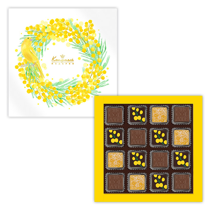 Состав: шоколадные массы – какао-масло, какао тертое, сахар, молоко сухое цельное, эмульгатор (лецитин соевый), ароматизатор («Ванилин»); начинки – сахар, патока, какао-масло, какао тертое, молоко сгущенное (молоко цельное, сахар (сахароза, лактоза)), молоко сухое, масла растительные рафинированные дезодорированные (подсолнечное, рапсовое, оливковое; масло сливочное (из пастеризованных коровьих сливок), молоко сухое обезжиренное), натуральные концентрированные соки (апельсиновый, лимонный), стабилизатор (мальтодекстрин, гуммиарабик), желирующие агенты (агар, желатин), коньяк (дистиллят коньячный, вода, сахар, натуральный пищевой краситель «Карамельный колер»), спирт этиловый ректификованный, консервант (сорбиновая кислота), регулятор кислотности (лимонная кислота), эмульгаторы (лецитин соевый, Е471), ароматизаторы; декор – пищевые красители (Е141, «Куркумин»). Продукция производится на предприятии, где используются арахис, кунжут, орехи, яичные и молочные продукты, злаки, содержащие глютен.