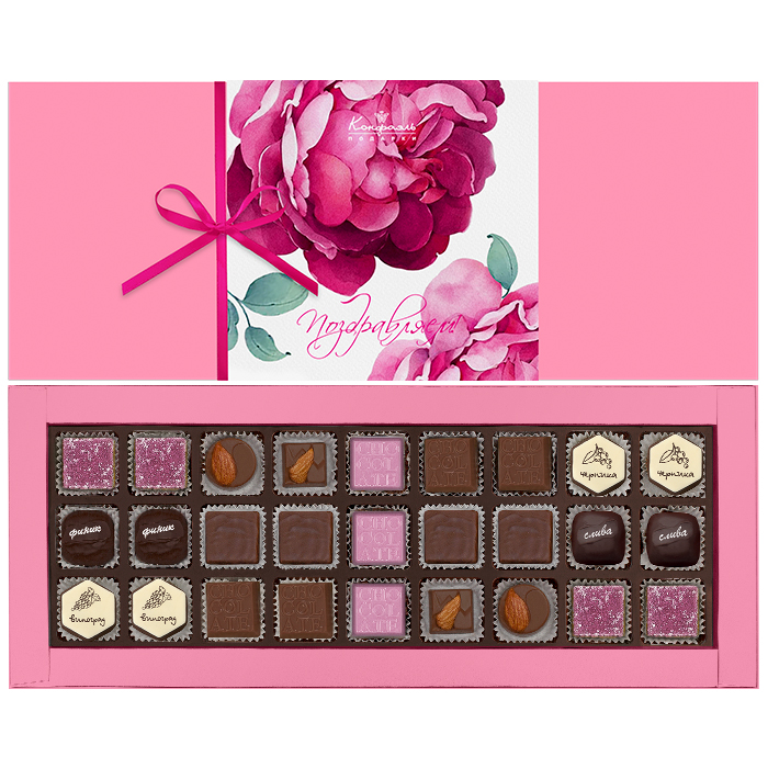 Состав: шоколадные массы - сахар, тертое какао, какао-порошок, масло какао, сыворотка молочная сухая, пахта сухая, сухое цельное молоко, эмульгатор (лецитин соевый); начинки - сахар, патока, масло какао, тертое какао, молоко сгущенное (молоко цельное, сахар (сахароза, лактоза)), сливки сгущенные с сахаром (сливки нормализованные, сахар (сахароза), лактоза), рафинированные дезодорированные (подсолнечное, рапсовое, оливковое; масло сливочное (из пастеризованных коровьих сливок), молоко сухое обезжиренное), масло сладко-сливочное, белок яичный, натуральные концентрированные соки (виноград, черника), финики, чернослив, ядра орехов миндаля, сахарная пудра, стабилизатор (мальтодекстрин), желирующие агенты (агар, желатин говяжий), коньяк (дистиллят коньячный, вода, сахар, пищевой краситель «Карамельный колер»), спирт этиловый ректификованный, экстракт лаванды, консервант (сорбиновая кислота), регулятор кислотности (лимонная кислота), эмульгаторы (лецитин соевый, Е471), ароматизаторы, пищевой краситель «Карамельный колер», декор - пищевые красители (Е132, Е171, свекольный концентрат). Внимание! В продукте возможно наличие фрагментов фруктовых косточек (кураги натуральной, фиников натуральных, чернослива натурального). Продукция производится на предприятии, где используются арахис, кунжут, орехи, яичные и молочные продукты, злаки, содержащие глютен.