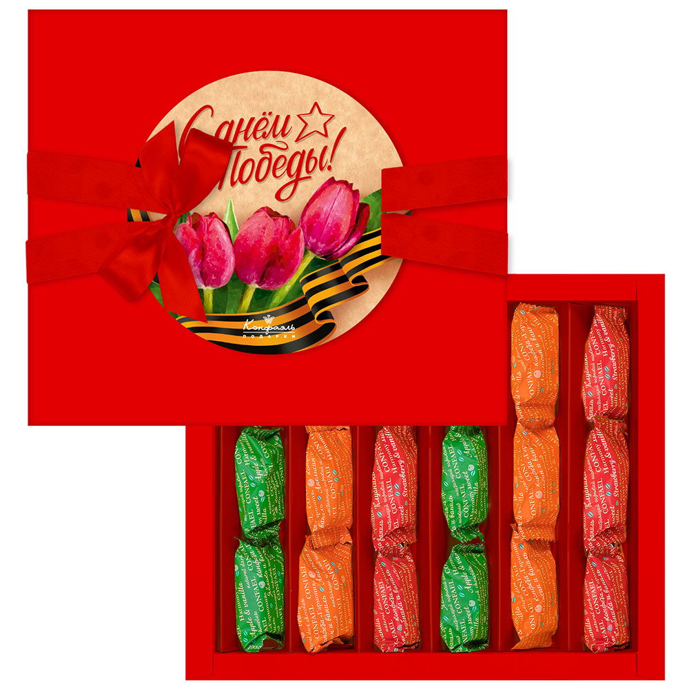 Состав: шоколадная масса – какао тертое, сахар, какао-масло, эмульгатор (лецитин соевый), ароматизатор («Ванилин»), начинки – сахар, патока, молоко сгущенное (молоко цельное, сахар ( сахароза, лактоза)), масло сладко-сливочное, яичный белок, натуральные концентрированные соки (клубничный, апельсиновый, яблочный), желирующие агенты (агар, желатин говяжий), консервант (сорбиновая кислота), регулятор кислотности (лимонная кислота), эмульгатор (Е471), ароматизаторы, натуральный экстракт ванили. Продукция производится на предприятии, где используются арахис, кунжут, орехи, яичные и молочные продукты, злаки, содержащие глютен.