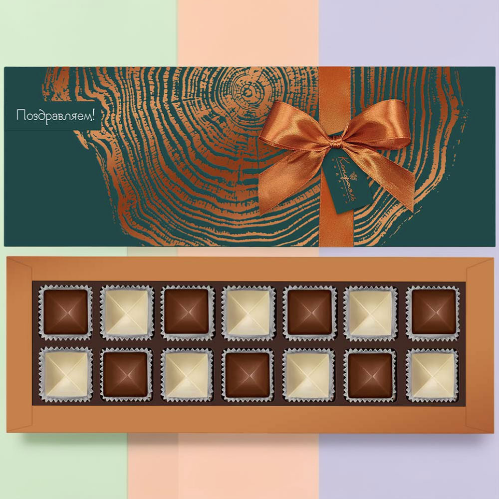 Состав: шоколадные массы - сахар, тертое какао, какао-порошок, масло какао, пахта сухая, сухое обезжиренное молоко, сухое цельное молоко, эмульгатор (лецитин соевый), соль, натуральная ваниль; начинки - сахар, патока, молоко сгущенное (молоко цельное, сахар (сахароза, лактоза)), сливки сгущенные с сахаром (сливки нормализованные, сахар (сахароза), лактоза), молоко сухое цельное, масла растительные рафинированные дезодорированные (подсолнечное, рапсовое, оливковое; масло сладко-сливочное, молоко сухое обезжиренное),сахарная пудра, жир специального назначения (масло ши, рапсовое масло, соевое масло), консервант (сорбиновая кислота), регулятор кислотности (лимонная кислота), эмульгаторы (лецитин соевый, Е471), ароматизаторы, пищевые красители «Сахарный колер». Продукция производится на предприятии, где используются арахис, кунжут, орехи, яичные и молочные продукты, злаки, содержащие глютен.