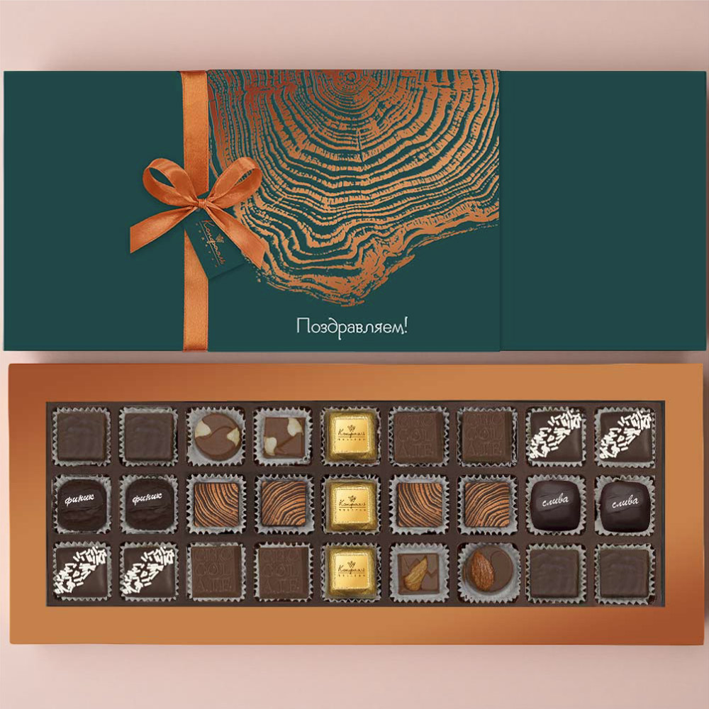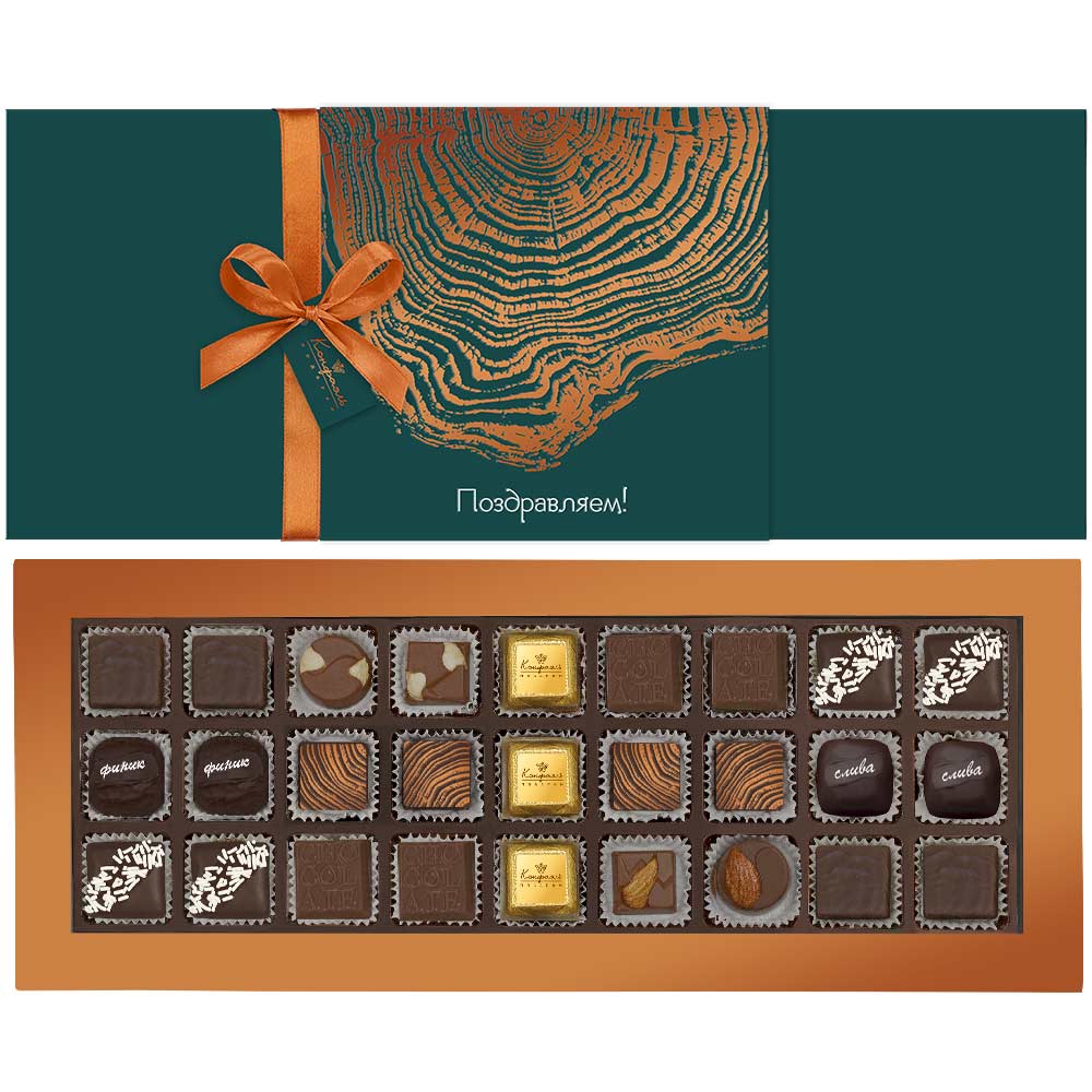 Состав: шоколадные массы - сахар, какао масло, сыворотка молочная сухая, сухое обезжиренное молоко, сухое цельное молоко, тертое какао, какао-порошок, пахта сухая, эмульгатор (лецитин соевый), соль, натуральная ваниль; начинки - сахар, патока крахмальная карамельная, какао-масло, какао тертое, молоко сгущенное (молоко цельное, сахар (сахароза, лактоза)), масла растительные рафинированные дезодорированные (подсолнечное, рапсовое, оливковое; масло сладко-сливочное, молоко сухое обезжиренное), жир специального назначения (масло ши, рапсовое масло, соевое масло, регулятор кислотности (лимонная кислота)), молоко сухое цельное, молоко сухое обезжиренное), масло сладко - сливочное, белок яичный, кумкват, клубника сушеная, вафельная крошка (мука пшеничная х/п первого сорта, сахар, масло кокосовое рафинированное дезодорированное, эмульгатор (лецитин соевый), пшеничные волокна (клетчатка), ароматизатор), цукаты апельсиновых корочек, папайя сушеная, ананас сушеный, финики, слива, ядра орехов фундука, ядра орехов миндаля, стабилизатор (мальтодекстрин), желирующий агент (агар), консервант (сорбиновая кислота), регулятор кислотности (лимонная кислота), эмульгаторы (лецитин соевый, Е471), экстракт ванили, экстракт лимона, ароматизаторы, пищевые красители (сахарный колер, медные комплексы хлорофиллов и хлорофиллинов, турмерик); декор - пищевой краситель (куркумин). Внимание! В продукте возможно наличие фрагментов фруктовых косточек кураги натуральной, фиников натуральных, чернослива натурального. Продукция производится на предприятии, где используются арахис, кунжут, орехи, яичные и молочные продукты, злаки, содержащие глютен.