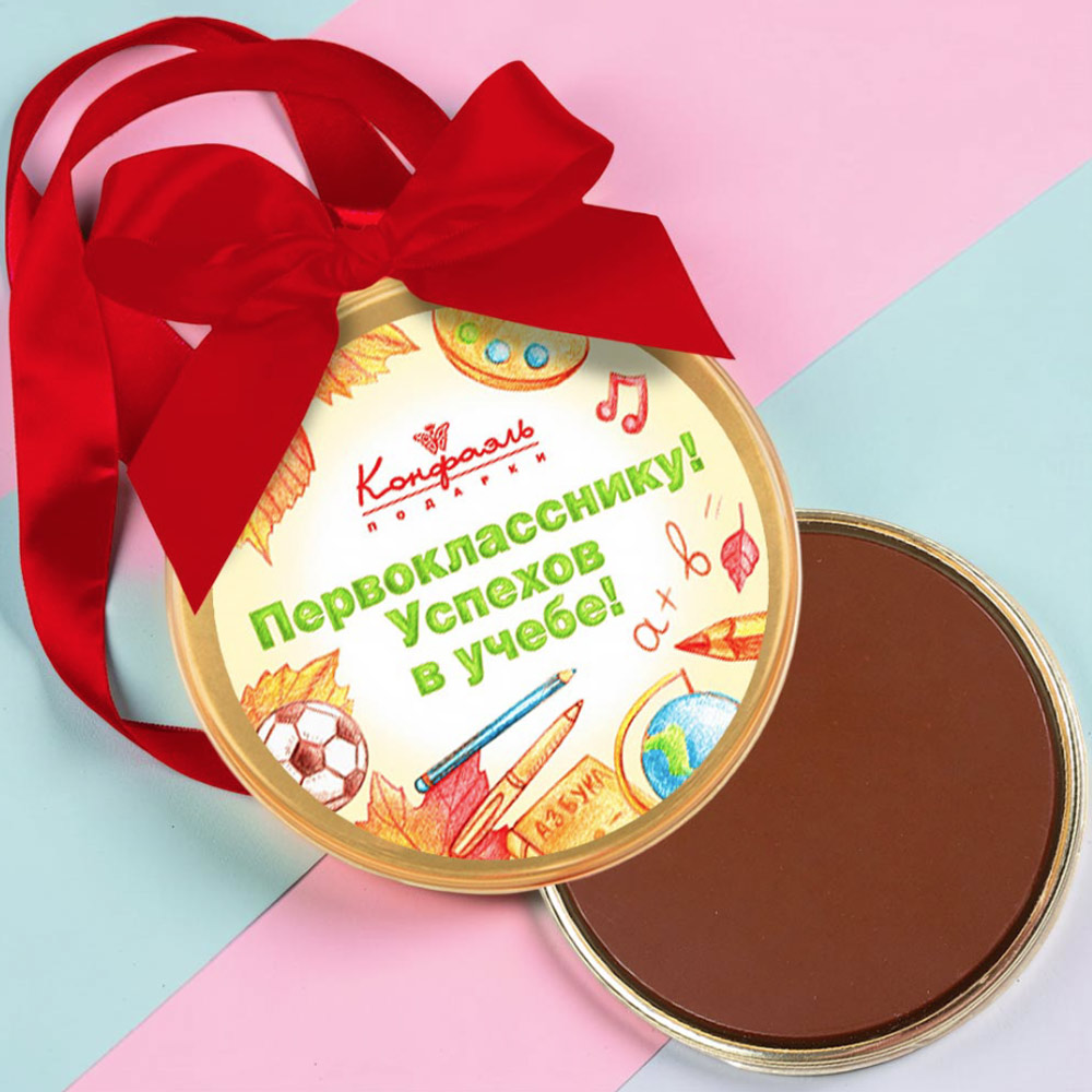 Для этой цели отлично подойдёт медаль «Вперёд к знаниям!», изготовленная из молочного шоколада и привлекающая детское внимание своим жизнерадостным дизайном.