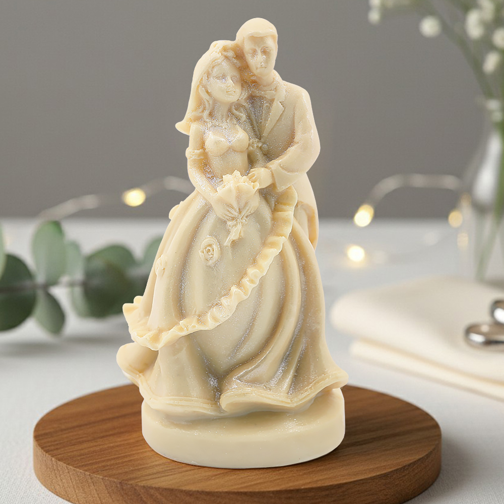 Их запечатленные в белом шоколаде образы вы можете как преподнести в виде подарка на праздник, так и сделать частью торжества, украсив стол брачующихся.