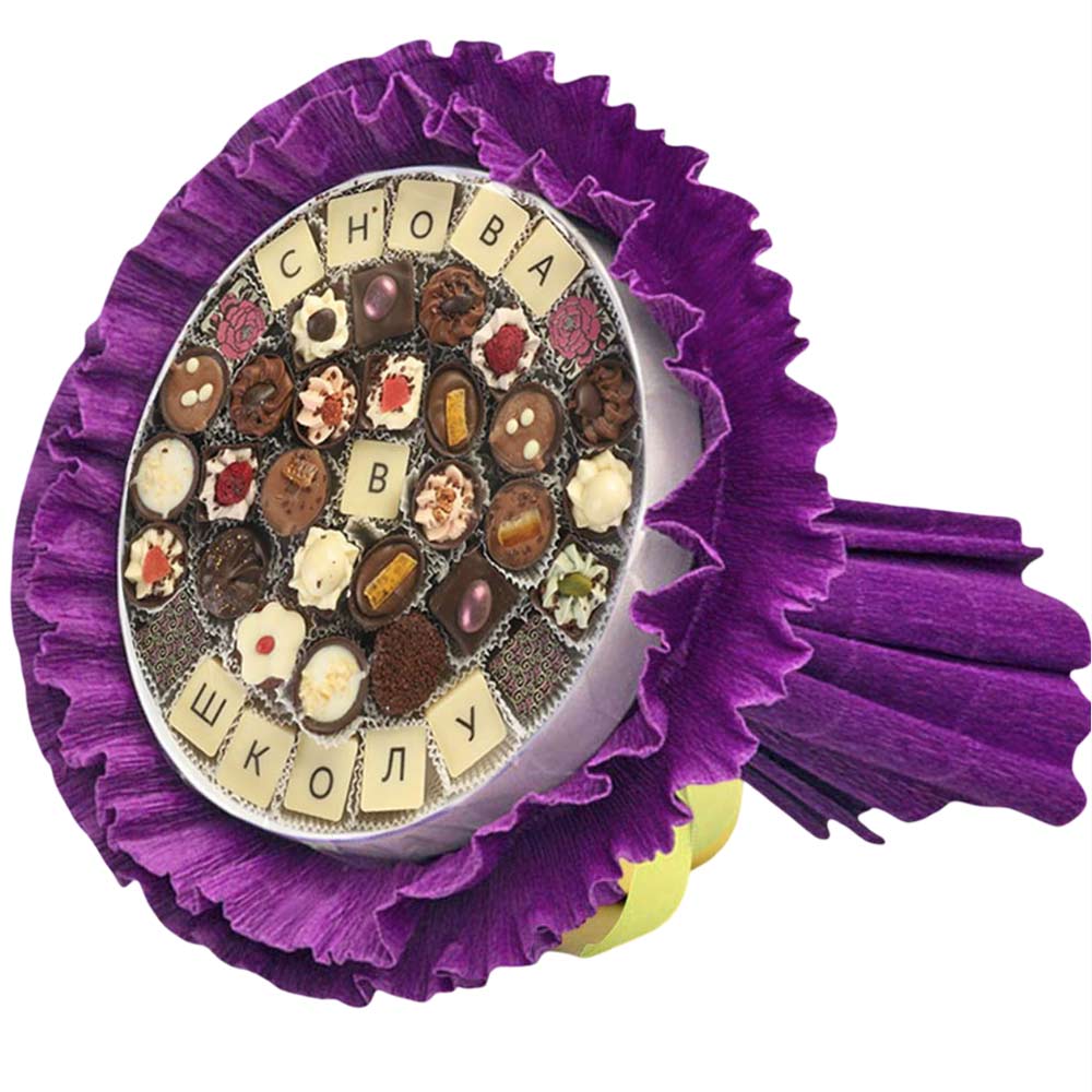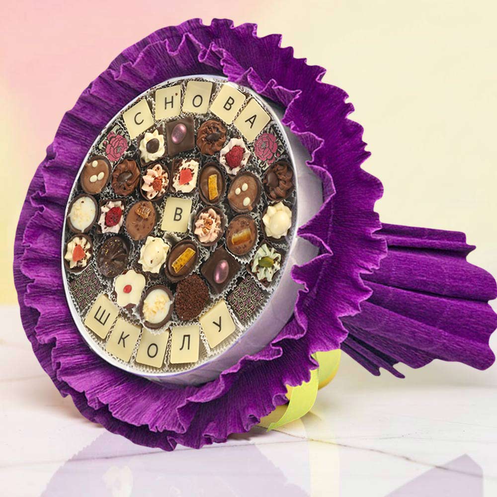Набор необыкновенно вкусных лакомств - желейного мармелада и конфет из элитного настоящего шоколада - в виде нарядного букета «Снова в школу».