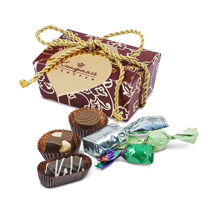 шоколадные массы – какао тертое, сахар, какао-масло, молоко сухое цельное, молоко сухое обезжиренное, лактоза, эмульгатор (лецитин соевый), ароматизатор («Ванилин»); начинки – сахар, патока, какао-масло, какао тертое, молоко сгущенное (молоко цельное, сахар (сахароза, лактоза)), молоко сухое цельное, молоко сухое обезжиренное, рафинированные дезодорированные растительные масла, абрикос сушеный, папайя сушеная, ананас сушеный, мандарин (кумкват) сушеный, ядра орехов миндаля, ядра орехов фундука, какао-порошок, лактоза, стабилизатор (мальтодекстрин), коньяк (дистиллят коньячный, вода, сахар, натуральный пищевой краситель «Карамельный колер»), спирт этиловый ректификованный, консервант (сорбиновая кислота), регулятор кислотности (лимонная кислота), эмульгаторы (лецитин соевый, Е471), ароматизаторы, натуральный пищевой краситель «Карамельный колер».