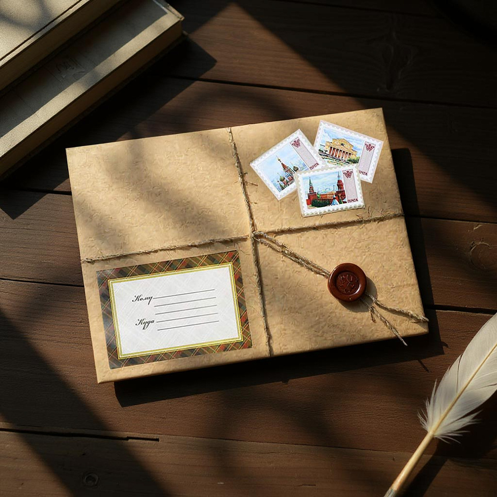 Упаковка: крафтовая бумага, сургуч, веревка, стикеры- оформление как телеграмма