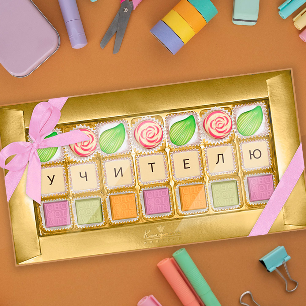 В красивой упаковке - самые вкусные конфеты! Они изготовлены из шоколада. Шокотелеграмма с текстом учителю - отличный сюрприз для педагога!