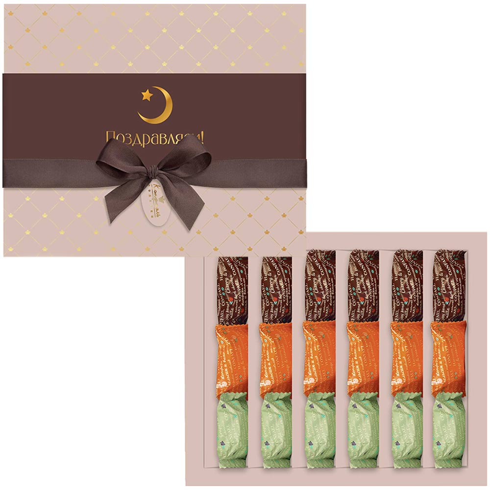 Состав: шоколад – сахар, тертое какао, масло какао, какао-порошок, эмульгатор (лецитин соевый), натуральная ваниль; начинки – сахар, патока, молоко сгущенное (молоко цельное, сахар (сахароза, лактоза)), масло сладко-сливочное, белок яичный, натуральные концентрированные соки (апельсиновый, виноградный, вишневый), желирующие агенты (агар, желатин говяжий), регулятор кислотности (лимонная кислота), ароматизаторы. Продукция производится на предприятии, где используются арахис, кунжут, орехи, яичные и молочные продукты, злаки, содержащие глютен.