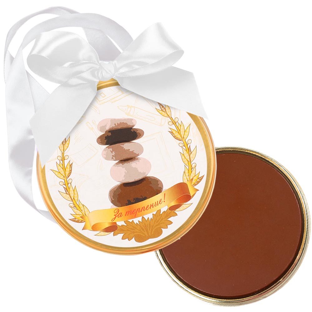 Медаль из молочного шоколада в дизайнерском оформлении - замечательный презент вашим близким! Ведь с его помощью вы легко докажете им, как высоко цените в них самое главное человеческое качество - терпение.