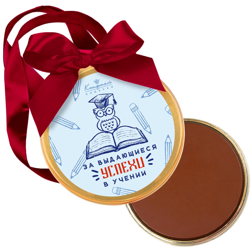 Эта шоколадная медаль - уникальный подарочный сюрприз, позволяющий вашему ребёнку-школьнику ощутить себя победителем и заодно полакомиться вкусным десертом.